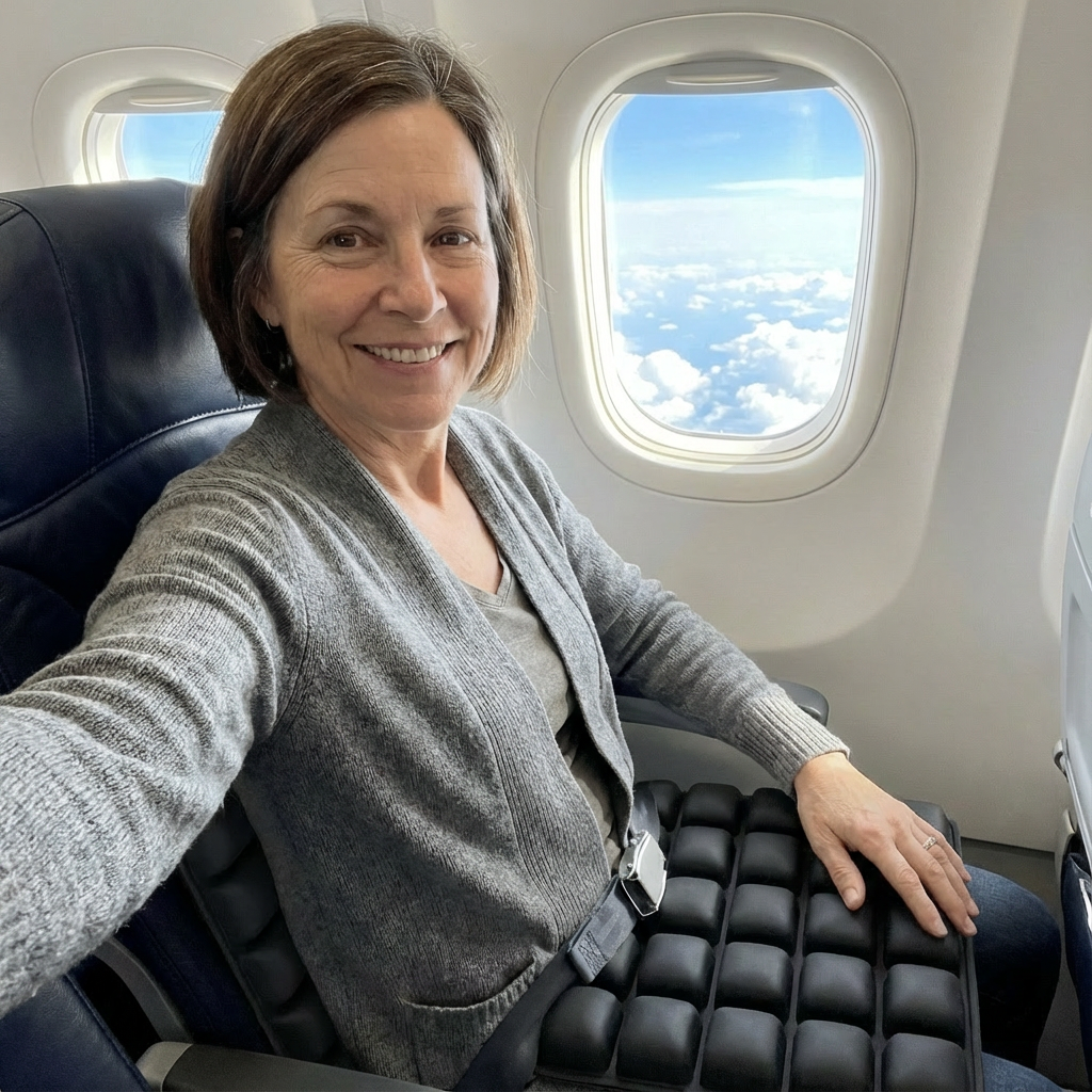 "I used to lose the first 2 days of every vacation just recovering from the flight. My tailbone would be so inflamed I could barely sit at dinner. My daughter convinced me to try AirGrid for our trip to Italy. I was skeptical - I'd wasted $300+ on other cushions that compressed into nothing. But this was different. After 11 hours to Rome, I walked off that plane and went straight to the Colosseum. My husband couldn't believe it. Now we've bought two - one for each of us."